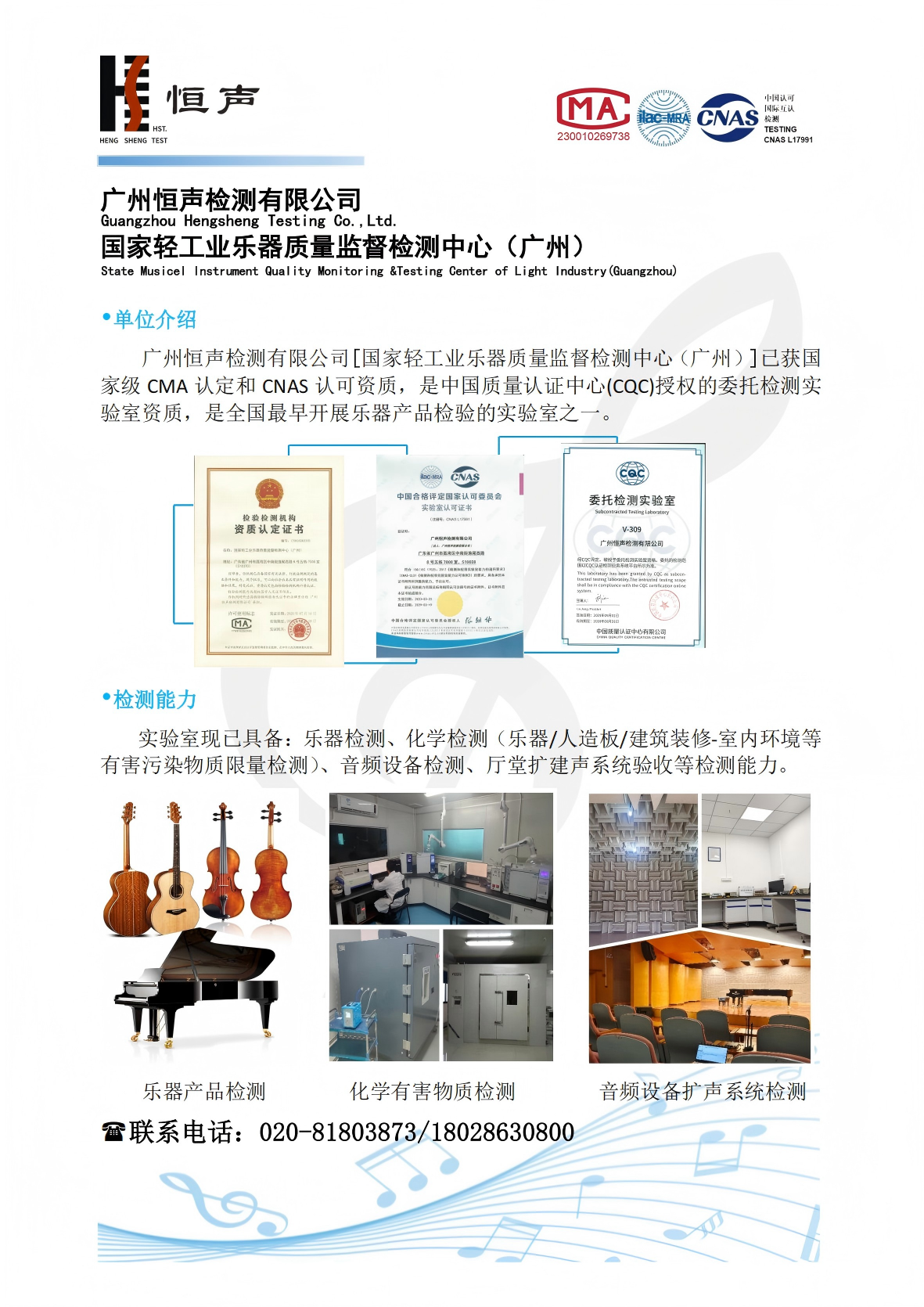 简介:已获国家级CMA认定和CNAS认可资质,中国质量认证中心(CQC)授权的委托检测实验室。检测能力:乐器检测、化学检测(乐器 人造板 建筑装修-室内环境... ...